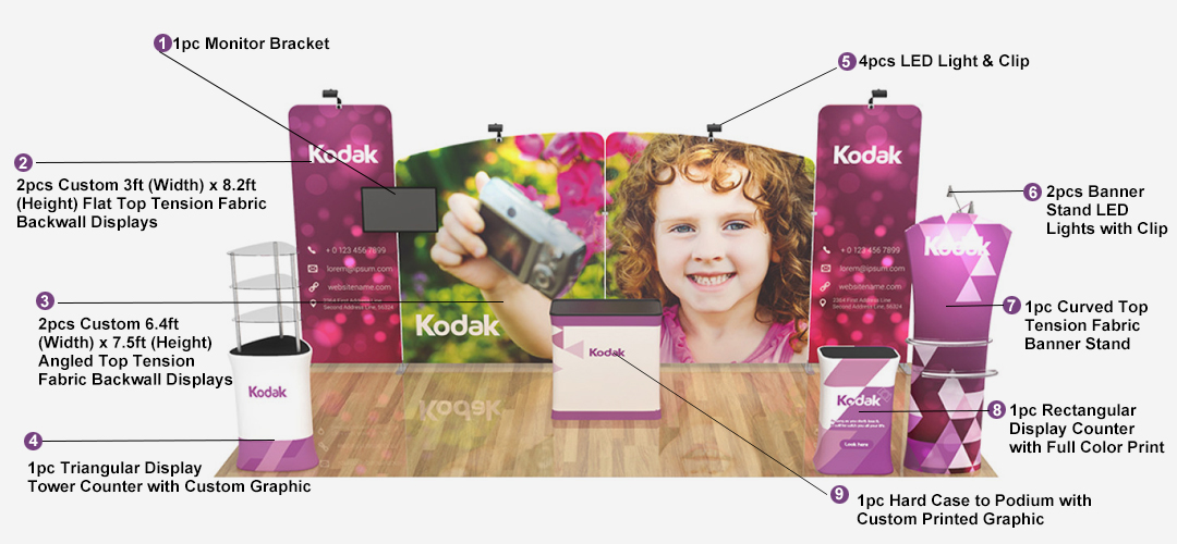 Featuring 1 rectangular display counter with full color print, 2 flat top tension frabric backwall displays, 2 angled top tension fabric backwall displays, 1 hard case to podium with custom printed graphic, 4 trade show display LED lights and clips, 1 monitor bracket, 2 banner stand LED lights with clip, 1 curved top tension fabric banner stand, 2 arm shelves for top tension fabric banner stand and 1 triangular display tower counter with custom graphic, this booth has the ability to engage any audience.