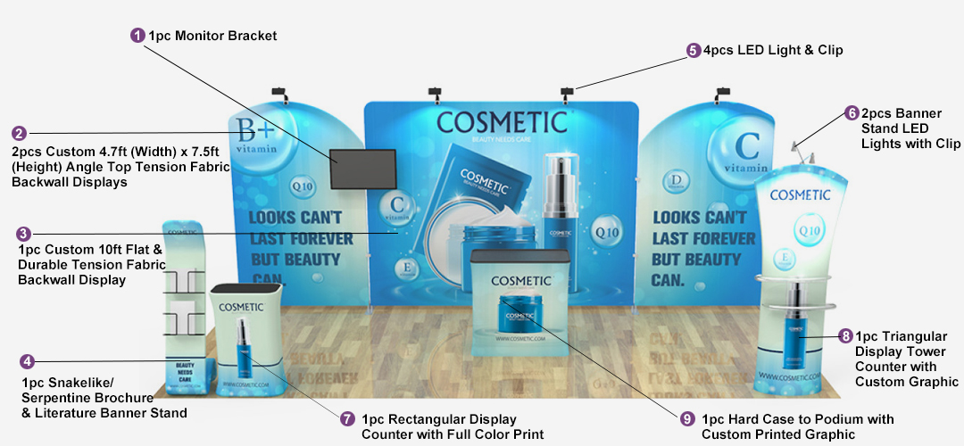 - Set includes backwalls, podiums, literature/shelving stands and more
