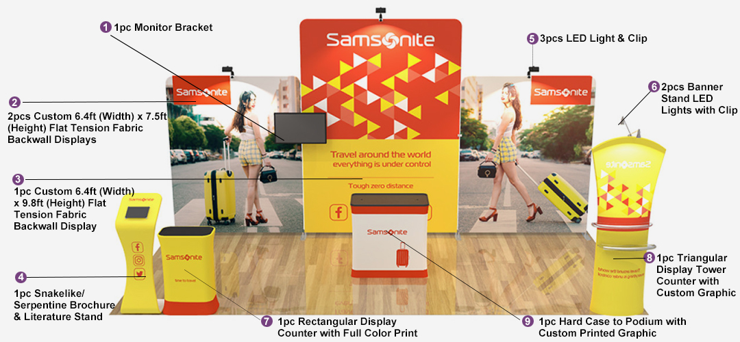 Featuring 2 custom flat tension fabric backwall displays, 1 custom flat tension fabric backwall display, 1 hard case to podium with custom printed graphic, 1 tension fabric iPad and tablet banner stand, 4 trade show display LED lights and light clips, 2 banner stand LED lights with light clips, 1 curved top tension fabric banner stand, 2 arm shelves for top tension fabric banner stand, 1 pc monitor bracket and 1 rectangular display counter with full color print, this booth has the ability to engage any audience.