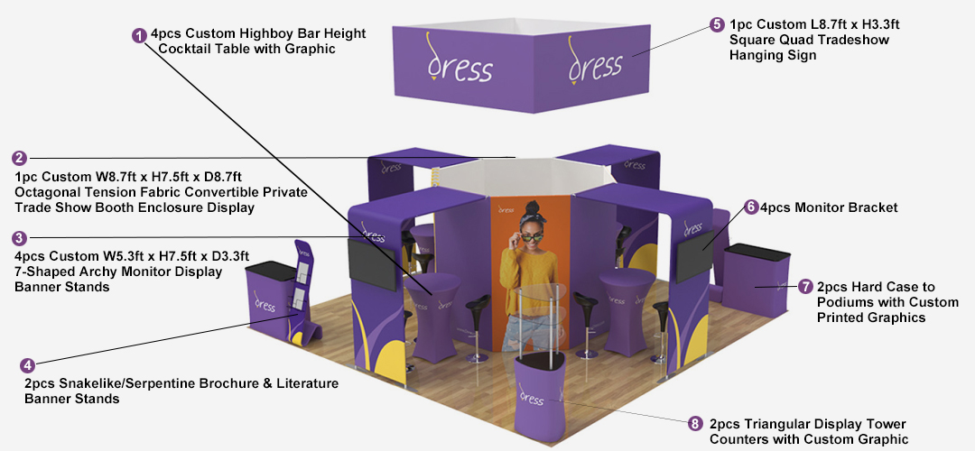 - 1pc Custom W8.7ft x H7.5ft x D8.7ft Octagonal Tension Fabric Convertible Private Trade Show Booth Enclosure Display